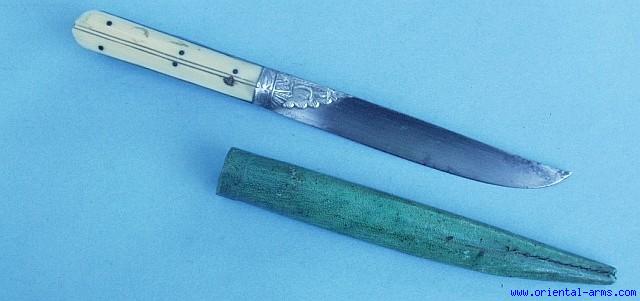 This is a small but very good and typical example of the knife from the island of Crete in the Mediterranean. The 5 ½ inches single edge blade, of hollow ground cross section, typically engraved and mounted with ribed ivory grips widening toward the pommel in a form of split ears. The bolster and grip strap are engraved silver sheet on pewter base. Wood scabbard covered with green leather. Total length in scabbard 9 ½ inches. Very good condition! , All parts original and in excellent shape. No replacements or restorations. |