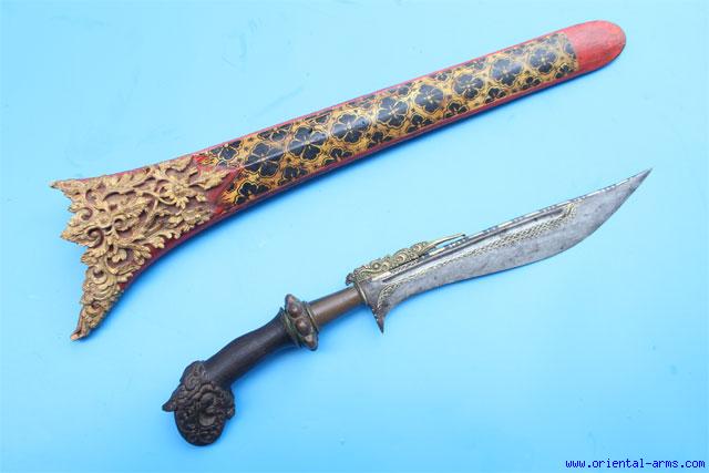 This fine piece is coming from Bali, Indonesia. It is a ceremonial knife, with some resemblance to the Wdung Knife ( also coming from Bali). The 10 ½ inches blade is short compared to the scabbard length, quite heavy and finely decorated with brass inlays and with a styled brass monster finely chiseled on the spine. The handle is carved horn with a big brass collar. The long scabbard is wood finely carved at its mouth and painted red black and gold. Total length (in scabbard) 25 inches. Very good condition. Lightly cracked and repaired scabbard. A fine piece of quality. For a similar piece, see Albert G van Zonneveld Traditional Weapons of the Indonesian Archipelago, page 74, Fig 287. |