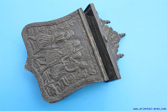 A container to hold bullets, made of heavy brass, 4 inches wide, 5 inches tall with a top hinged lid. Late 19 C. Very good condition.