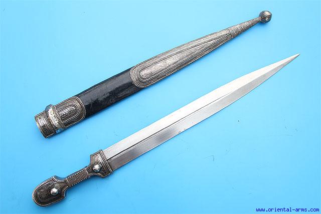 This Kindjal dagger is Georgian, early 20C. Nicely fullered 13 inches blade. Whole silver handle engraved, nieloed and decorated with silver granulation decoration. Leather bound scabbard with large silver locket and chape also decorated en-suite with the handle. Total length 20 inches. Very good condition. Minor losses to the niello decoration. |