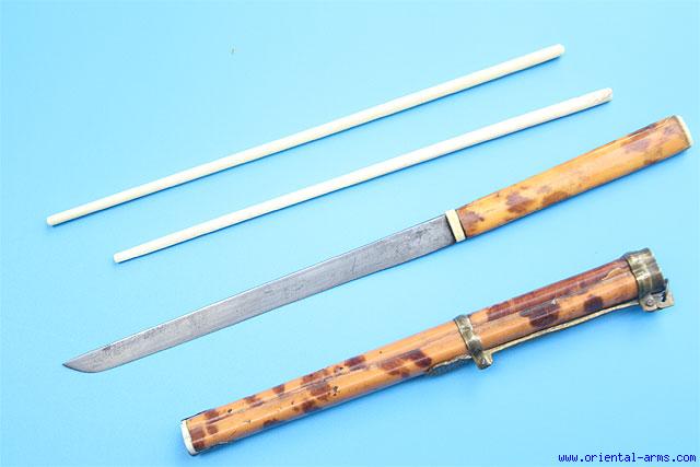 A Chinese ‘trousse’ (eating set), comprising a knife and chopsticks. This type of sets was very common in china and in all the countries under the Chinese influence from Tibet to Mongolia. It was part of a man formal dress up to the turn of the 20th century and usually accompanied with a variety of accessories like pickle spear, toothpicks, tweezers and the like. Similar sets are found in various sizes and quality. This one is a good quality one. The slender blade is 6 inches long. The grip and the scabbard are wood covered with tortoise shell with bone pommel cover and collar, Chopsticks are bone. Total length 11 inches. Very good condition. |