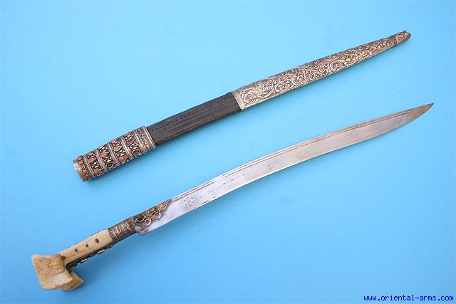 This Yataghan sword is most probably coming from the Balkan areas of the Ottoman empire, mid 19C. 19 inches down curving double fullered blade decorated with silver inlay inscriptions in Arabic letters. Walrus grips with wide, square cut pommel ears. Gilded copper grips strap and bolsters, finely decorated and set with coral stones and two green stone on the bolsters. Original scabbard covered with black leather and large gilded silver locket set with many corals and finely chased gilded silver chape. Total length 26 inces. Very good condition. Old repairs on the grips. |
