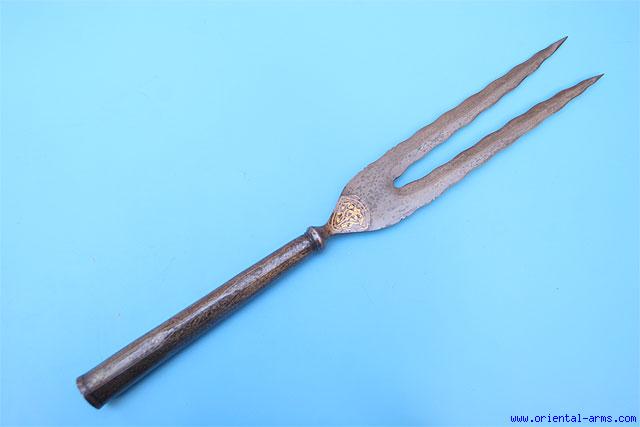 This spear head is Persian, late 18 - early 19 C. , early Qajar period. Double blade 12 inches long with thickened tips, forged from laminated steel. Tube socket. The base of the blade and the socket are decorated with gold koftgari work. Total length 21 inches. Very good condition. |