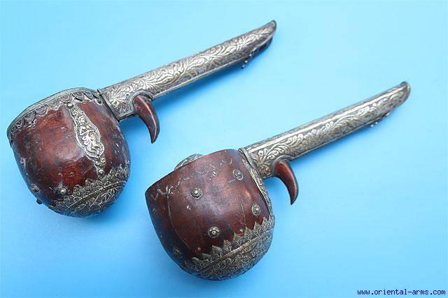 Not exactly a weapon but a very good example of Caucasian decorative arts: A pair of wine pouring flasks, probably Georgian, late 19 – Early 20 C. Wood flask decorated with chased silver (low) panels and a long neck covered with chased silver (low). Length 10 ½ inches. Very good condition. Silver panels missing. |