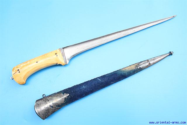 This Karud dagger is the straight back member of the family of the Pesh-Kabz, Choora and Khyber Knife. The whole family of such daggers is common to India, Persia and several Central Asian countries. This fine exemplar is most probably of North India origin, mid – late 19C. The blade is forged from wootz (Damascus, watered ) steel, 9 ½ inches long, with a pronounced T spine tapering to an acute tip. The grips are made from slabs of Elephant ivory. The bolsters and grip strap are steel. Original scabbard covered with original blue and mounted with silver mounts. Very good condition. Impressive dagger. |