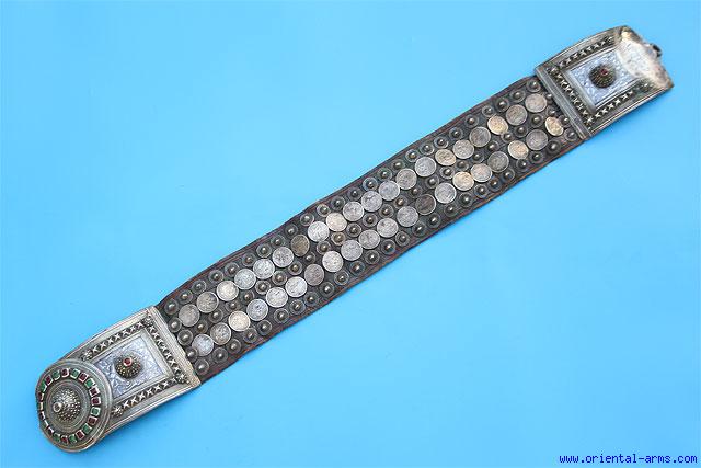 This heavy belt is of Caucasian origin. It is dated to 1283 (1866 in the Gregorian calendar. 33 inches long, 4 ½ inches wide leather base richly set with 40 Imperial Russian silver coins, multitude of silver buttons and big silver buckle, set with red and green gem stones and finely niello enameled. Total weight 1245 Grams. A unique and rare item.