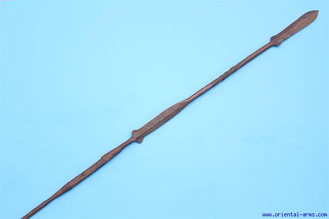 From southern Kenya, where the Massai people reside comes this spear. It is also known as Lion Spear supposedly used by young warriors to hunt a lion as a proof for their courage and manhood. True story?? We do not know. This one is early to mid 20 C. and of somewhat unusual shape. Heavy blade with twisted tang, 26 inches long. 27 inches long steel tail. Short wood handle in the center. Total length 56 inches. Very good condition. |