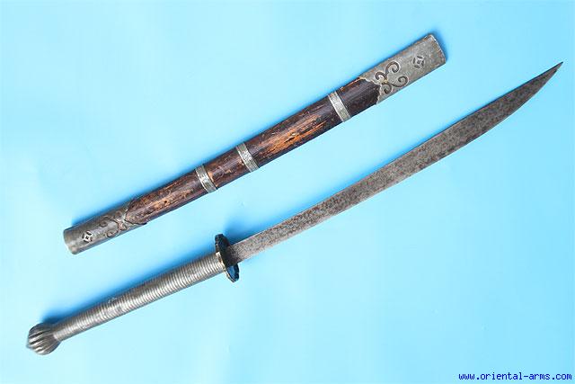 This sword is coming from North Thailand or further north. Early – mid 19C. Heavy blade 22 inches long. Two handed 13 ½ inches long handle. Grip bound with Pewter bands and a pewter bud shaped pommel. Brass cross guard. Wood scabbard with pewter mounts. Total length 38 inches. Very good condition. Strong Chinese influence. |