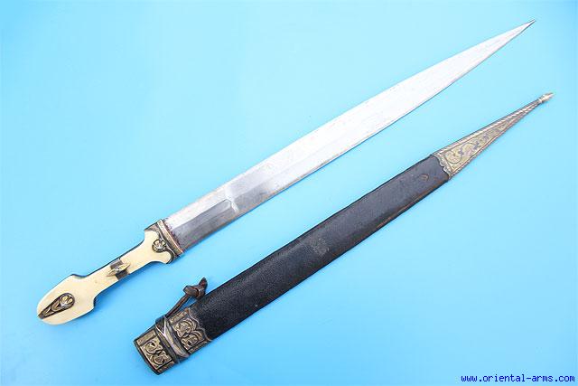 This fine Qama dagger is dated to 1312 (1894 in the Gregorian Calendar). The unusual blade of shallow hexagonal / diamond cross section is 16 ½ inches long. The grips are walrus ivory on the front side and black horn on the rear. All mounts are finely chiseled gilded and nielloed silver. The back of the locked is dated. Total length 23 ½ inches. Very good condition. One rivet cap on the back of the grip is missing |