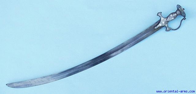 This Tulwar sword is very well made fighting weapon and meant for business. The blade is heavy single edge, 35 inches long with 9 inches false edge. It is of European origin and the word MOL… is stamped on the spine near the hilt. The hilt is typical big steel handle richly decorated with silver koftgari work in a floral pattern. Very good condition. No scabbard . Very attractive price |