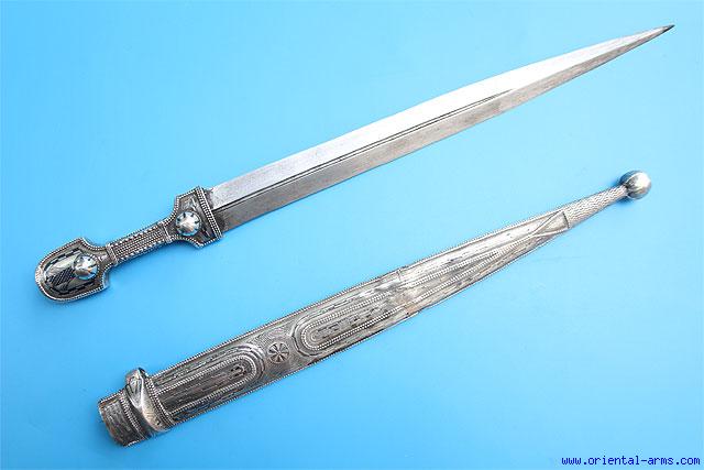 This silver mounted Kindjal dagger is early 20C. 13 ½ inches blade, well forged and nicely fullered. Whole silver handle and scabbard, finely engraved and decorated with silver granulation work. Total length 20 inches. Very good condition. Old solder repair at the center of the scabbard. |