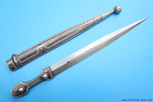 This very fine Kindjal dagger is early 20C. Finely forged and fullered slender blade of diamond cross section marked with a maker sign. Blade length 13 inches. Fine silver handle and scabbard, richly decorated with fine flat niello design and silver granulation work. Total length 19 inches. Very good condition. Minor dent on the ball finial of the scabbard. |