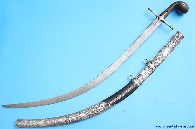 We offer for sale this very fine Turkish Shamshir sword, with a Heavy 18C. blade forged from high contrast Persian wootz steel, ladder pattern, with high contrast pattern, Blade length 33 inches long marked with the Persian lion and maker mark in true gold inlay. The grips are massive, rhino horn with bulbous pommel. Silver cross guard and grip strap. The heavy silver mounts of the scabbard are later, dated to 1340 (?) ( 1920 in the Gregorian calendar) scabbard mounts are silver. Leather covered scabbard with silver spiral stitching. Total length 40 inches. Very good condition. Very impressive heavy sword. |