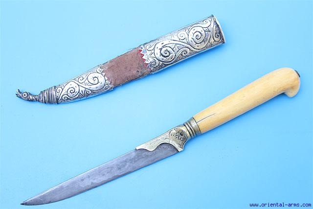 This small Kard knife is Turkish, mid-late 19C. The pattern welded steel blade is 5 inches long. Brass bolsters and elephant ivory handle. Original scabbard with fabric cover and chased silver mounts. Total length 10 inches. Very good condition. The fabric cover of the scabbard is worn. |