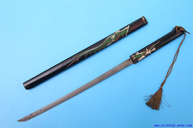 Up for sale is this long knife, Chinese, early 20C. Fine, slender, single edge blade 12 inches long. Wood handle and scabbard, black lacquered and painted in strong colors. Total length 19 inches.Very good condition. Some marks on the blade, probably from excess etching. |