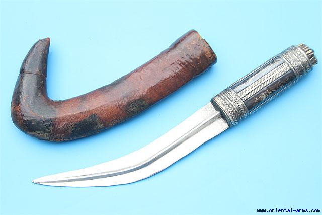 This unusual dagger is a rare version of the Yemenite Jambiya, although sometimes found in other regions of the Arabian peninsula. The blade of classical form but narrower, with a pronounced central rib. The handle of cylindrical form is made of silver, with fine filigree decoration. Leather covered scabbard with uprising tip. Blade 8 inches, total 12 inches. Very good condition. A belt probably made of leather, which was connected to the rear side of the scabbard is missing. |