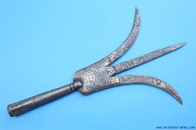 This unusual spear head is Indian, early – mid 19 C. It is of a trident shape with the side blades flared out. Heavy steel and richly decorated with silver koftgari work. Length 17 inches. Very good condition. Losses to the silver inlay. This item is coming from the John Woodman Higgins Armory Collection . Acquired in 1931