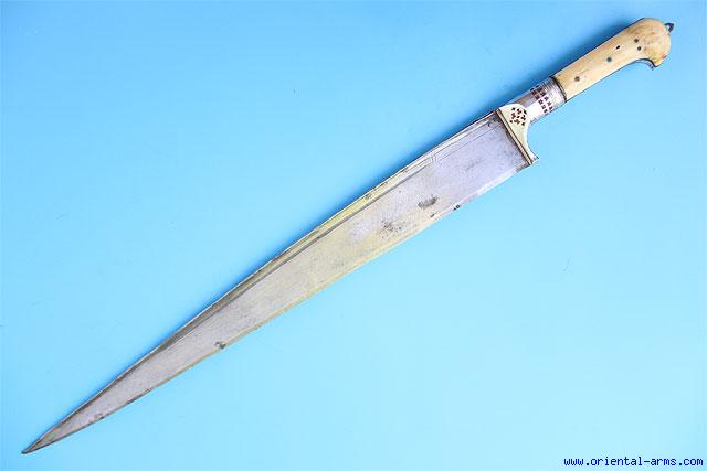 This is a classical example of a fine Indian Khyber sword coming from North India, early – mid 19C. The heavy massive blade is 23 inches long 2 inches wide, with a pronounced T spine. The bolsters and grips are silver decorated with black and red “stars”. The grips are ivory with good age patina. Total length 28 ½ inches. Very good condition. Minor edge nicks and blackened spots on the blade. |