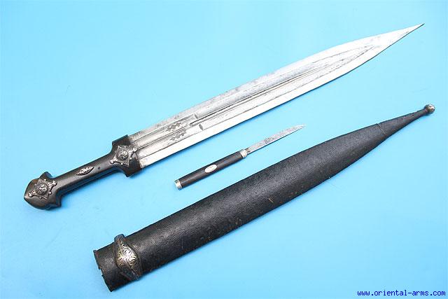 This fine Qama is from Dagestan, late 19 C. Very well forged fullered and marked blade with fine etching inside the fullers. Grips of black horn with steel rivets and very fine silver rosettes decorated with nilello design. Original scabbard and leather cover. Fine nielloed silver belt ring and scabbard tip. Blade 17 ½ inches long 2 inches wide. Total 24 ½ inches. This Qama comes with its original by knife in a compartment on the back of the scabbard. The by knife is 7 ½ inches long with horn handle and silver mounts. Very good condition. Minor blackened spots on the blade . Losses to the back side of the scabbard.