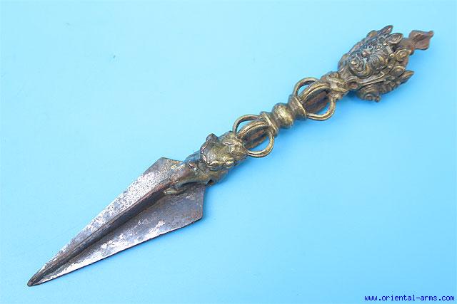 The Phurbu is the Tibetan Exorcist dagger used by the lamas to drive out evil spirit. This one is a late 19 C., with a 4 inches steel blade. Bronze handle in a monster mouth shape holding the blade and three different faces on the pommel. Total length 9 ½ inches. Very good condition. |