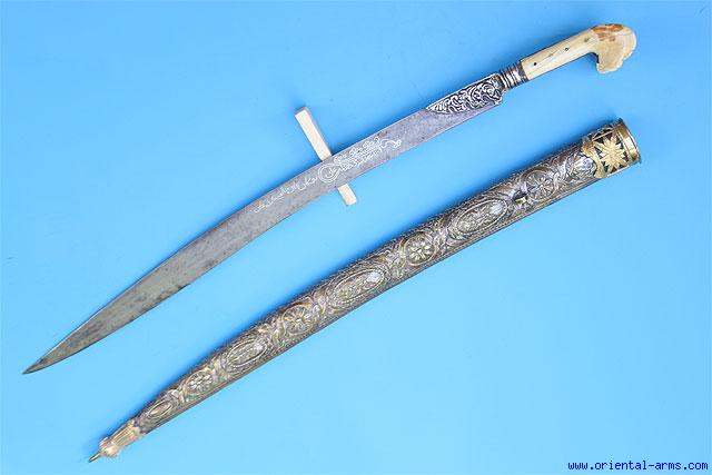 This very fine yataghan is dated to 1290 (1789 in the Gregorian calendar) The 22 inches finely forged blade is inlaid with silver (true inlay) with inscriptions in Arabic letters and dated. The grips are elephant ivory and the bolsters and grip strap are very finely chased silver. The scabbard is whole heavy gilded silver very finely chased. Total length 30 ½ inches. Very good condition. |