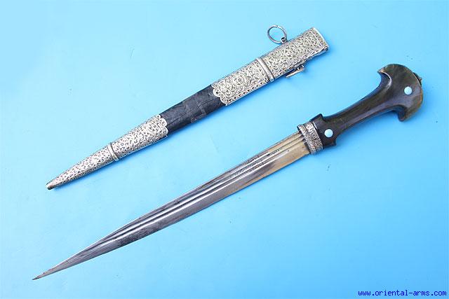 The Genoui, is a rare variant of the classical Moroccan ‘Koumaya’ curved dagger with straight blade. The name literally means from Genoa, probably to indicate its ancient source. The straight 14 inches fullered blade is cut from an old sword, engraved with Arabic inscription and fitted with a massive horn handle set with Turqouise stones (one replaced). The scabbard is wood mounted with finely chased silver mounts. Total length 20 inches. Very good condition. |