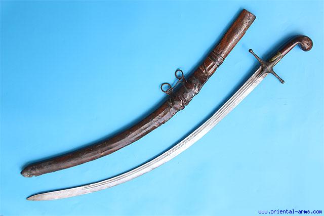 The Bedouins of Israel, Palestine and the Sinai peninsula will convert any available blade to a useful fighting sword, and we find a very interesting mixture of blades, handles and scabbards with this group. The sword here is an excellent example: A curved fullered blade, most probably a European trade blade, a Turkish style handle and cross guard. Hide covered wood scabbard. Blade 31 inches, tota; 36 inches. Very good condition. Authentic, late 19C. sword. |