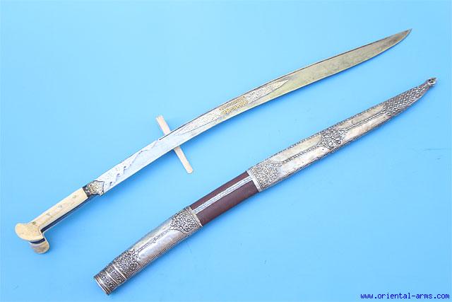 This very fine yataghan is dated to 1242 (1826 in the Gregorian calendar) The 25 inches finely forged blade is finely and richly decorated with gold and silver koftgari inlay work, with inscriptions in Arabic Letters and dated. The grips are walrus ivory and grip strap and bolsters are steel with rich silver inlay work. The leather covered (later) scabbard is mounted with large silver locket and chape. Total length 32 inches. Very good condition. Minor losses to the gold inlay. Minor dents on the silver parts of the scabbard. |
