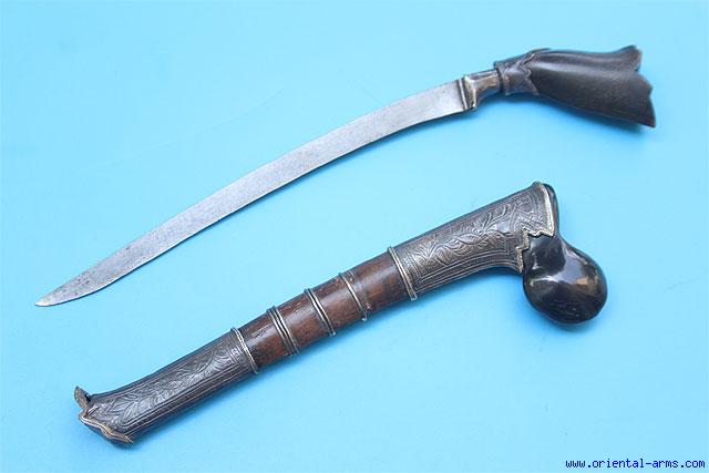 A very good Sewar knife / Dagger (also some times called Bade-Bade) from Sumatra: 7 inches down curving blade with silver covered bolster. Horn handle with filigree silver collar. Wood scabbard with finely chased silver locket and chape. Total length 10 inches. Very good condition. Very good age patina on the silver. Very small chip on the pommel. Minor dent on the silver chape. |