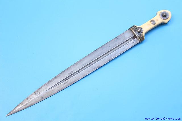 This Qama short sword is Georgian, late 19 C. of big dimensions: Blade 17 ½ inches long, 2 ¼ inches wide with off centered deep fullers heat hardened edges and engraved signature. Walrus ivory grip slabs with domed rivets and gilded nielloed silver rosettes and collar. Total length 22 ½ inches. Very Good condition. Minor edge nicks. Very impressive short sword.. |