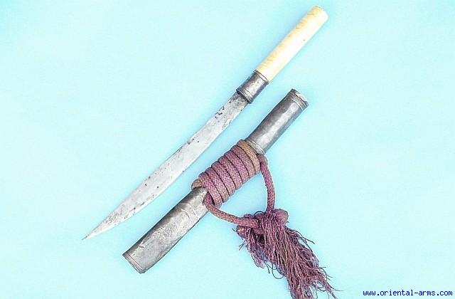 A small Dah knife from Burma. The slightly curved blade is 12 ½ inches long. The grip is a massive piece of elephant ivory with very good age patina. The scabbard is wood covered with silver sheet and bound with the original red cotton baldric belt. Good condition. The silver tip of the scabbard is missing. |