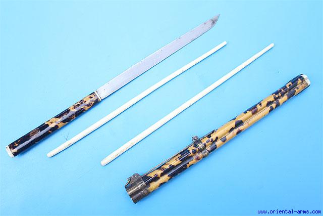 A Chinese ‘trousse’ (eating set), comprising a knife and chopsticks. This type of sets was very common in china and in all the countries under the Chinese influence from Tibet to Mongolia. It was part of a man formal dress up to the turn of the 20th century and usually accompanied with a variety of accessories like pickle spear, toothpicks, tweezers and the like. Similar sets are found in various sizes and quality. This one is a good quality one. The slender blade is 5 1/2 inches long. The grip and the scabbard are wood covered with tortoise shell with bone pommel cover and collar, Chopsticks are bone. Total length 11 inches. Very good condition.