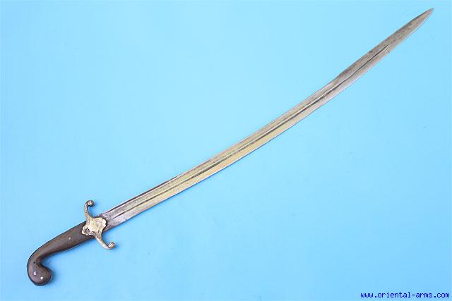 Up for sale is this Turkish military saber for use by high ranking officers in the Turkish army, late 19 C. or very early 20 C. The saber employs a military style blade, most probably of European origin, 31 inches long wit a 10 inches raised back edge (Yelmaen) Horn grips with white metal grip strap and cross guard. Total length 37 inches. Very good condition. Minor loss to the grip strap.