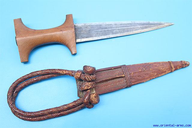 A nice Sudanese arms dagger with double edge blade with central ridge. Unusual double arm loop. Brown leather scabbard with Minor losses. Old Austrian brass jiton on the pommel signed R. DITMAR VIENNA MADE IN AUSTRIA. Total length 13 inches.