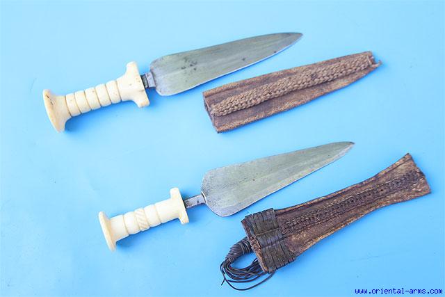Here we offer quite rare short daggers of the Mangbetu people. the Mangbetu live in north east Congo and were famous for their high quality art and craft especially musical instruments and weapon.The daggers has very nice double edged hand forged blades 5 1/2 inches long. original leather scabbards with nicely braided seam. Carved Ivory handles. Total length 9 1/2 inches. Early 20th Century. |