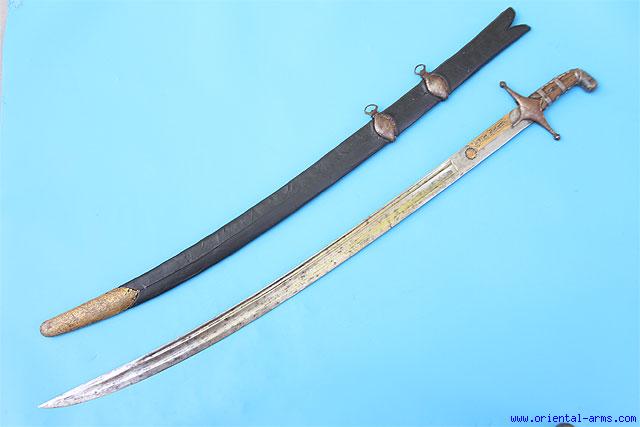 This sword is of Georgian origin from early 19c. It was carried by the Khevsur people who lived on the north east part of Georgia in the area of the Georgian great mountains near Ossetian and not far from Chechnya. The Khevsur were exceptional warriors with traditional Georgian qualities of courage, openness and honesty, independence and love of freedom who were often promoted as royal bodyguards. It has a well forged, nicely fullered blade, 33 inches long. The blade is marked with a deep maker stamp inlaid with gold, and has very nice gold inlaid Georgian (?) inscription. Wood handle covered with silver rosettes and rings and silver pommel decorated with niello work. Steel cross guard retained few gold inlaid decoration. Original scabbard with recent leather cover and steel mounts also inlaid with some gold. Total length 38 1/2 inches. Very good condition. A very rare sword to find and real. Most examples on the market are recently made. Bottom mount is old but not belong. |