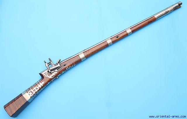 Up for sale is this heavy Miquelet gun, late 18 . Turkish origin with typical Miquelet lock. Barrel made from very fine twisted steel with fine contrast, stamped with maker mark and bound with engraved silver bands. multi range large rear sight. Heavy Stock from beautiful grain wood inlaid with silver inserts. Total length 51 inches inches. Very good condition. |
