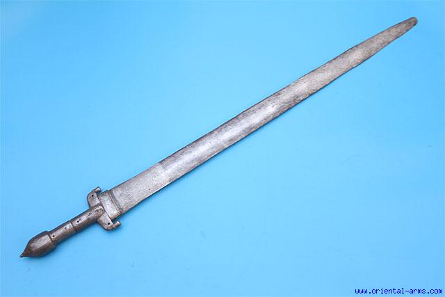This very rare and early sword comes from Oman, late 16 or early 17 C. Very wide 2 1/4 inches 24 1/2 inches long, forged from Wootz (Damascus) steel. Whole steel handle with Turban shaped pommel and down curving quillons.. Total length 32 inches. Very good condition to age. A much rare and sought after sword. |