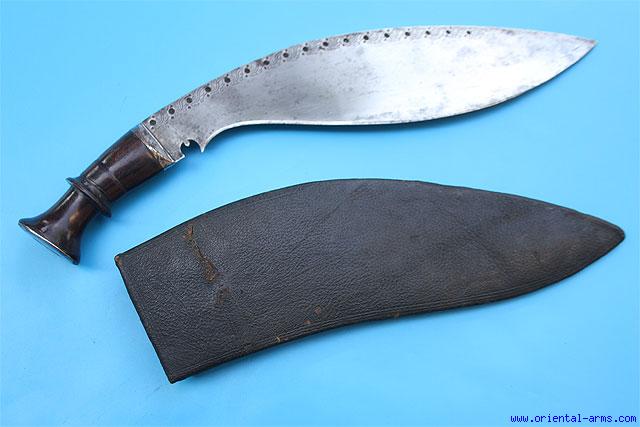 Up for sale is this big Khukuri, the Big belly style, also known as Budhume, with a heavy, down curving blade, 14 inches long 3 ½ inches wide and ½ inches thick blade, with ridged spine and steel bolsters. The spine line is decorated with engraved flowers and deep punced circles. Horn handle with steel pommel plate. Original leather covered scabbard.. Total length 18 inches. Very good condition. Karda and Chakma ( knife and steel) missing. A very impressive Khukuri. |