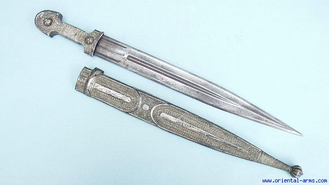 We offer for sale a good Georgian Kindjal dagger, a good old blade, probably mid 19 Century, mounted in a later, early 20 C. silver hilt and scabbard in a classical Georgian filigree and niello decoration style. The blade is 13 ½ inches long with a central double fuller. The total length in scabbard is 19 inches. Good condition. Some silver damage to the hilt. |