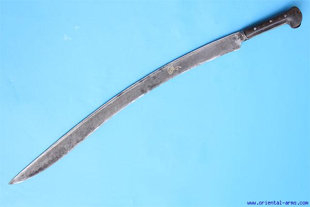 This yataghan sword is Turkish, late 18 – early 19 C. The 25 inches marked blade is forge welded from several twisted steel rods in a pattern known as Turkish Ribbon. The grips are horn. Total length 29 1/2 inches. Very good condition. The blade is inlaid with Tugra signature. |