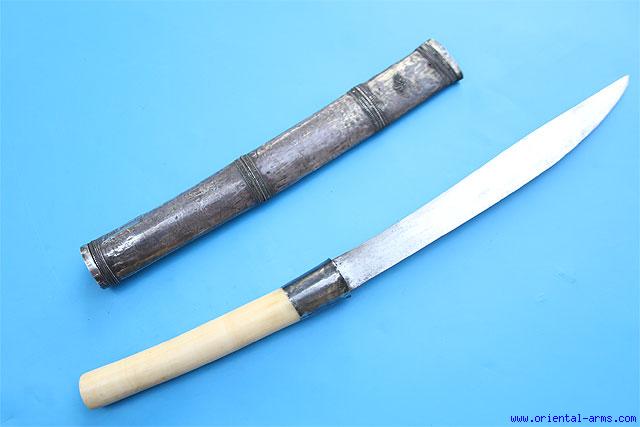 This large Dah knife is Burmese, late 19 C. Very well forged thick blade 5 inches long 13 mm thick with ridged spine. Large, two handed 8 ½ inches long cylindrical, elephant ivory grip with silver collar. Filigree silver covered scabbard. Total length 22 inches. Very good condition. Minor dents on the silver. The grip collar is later. |