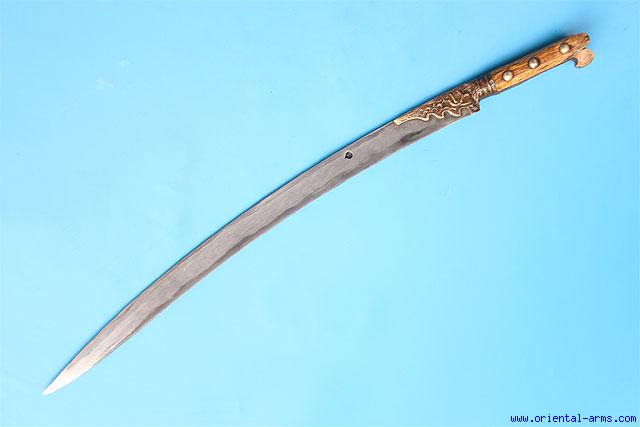 This Yataghan sword is Turkish, late 18 – early 19 C. The 24 inches marked blade is forge welded from several twisted steel rods in a pattern known as Turkish Ribbon. The grips are bone and the bolsters as well as the grip strap are chased brass.Total length 29 inches. Very good condition. Fine blade with good pattern of strong contrast. Cracks on the grips. |
