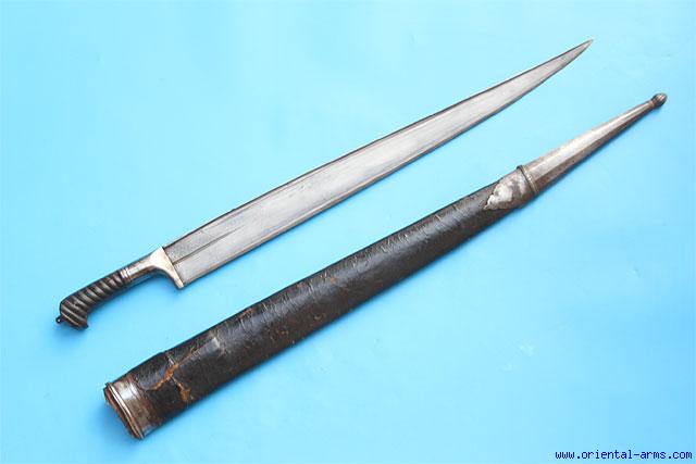 The Khaybar sword (Also Known as Salawar Yatagan) is the common side arm of the Afrids people residing in the area of the Khaybar pass between Pakistan and Afghanistan. It is easily recognized by its straight blade, pronounce T spine cross section and tapering tip. This one has a heavy 23 ½ inches long blade of Indian wootz stel. The handle is of horn with faceted steel bolsters and steel grip strap. The scabbard is wood, covered with black leather (slightly worn at the top) and mounted with the original heavy faceted steel chape. Total length 33 inches.Very good condition. A real fighting impressive item.