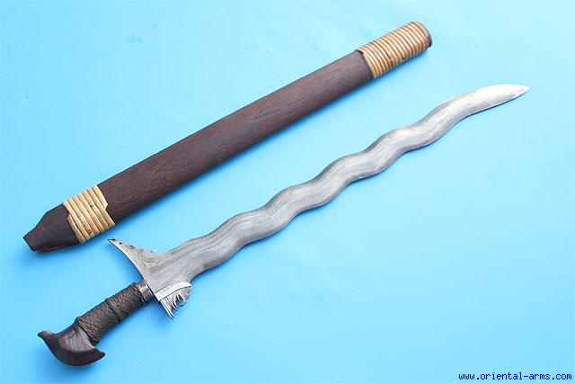 This Moro kris sword is late 19 - early 20C. with wavy blade 22 inches long, finely forged from laminated steel core and heat hardened high carbon steel edges. Grip bound with braided rattan strips and has a Cockatoo style pommel of good age color. Scabbard with rattan bands. Total length 27 inches. Very good condition. Very good age patina on the wood. Minor damage to the rattan binding. The scabbard is partially repaired and restored. |