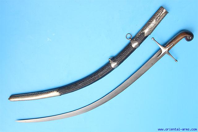 We offer for sale this very fine Turkish Shamshir sword, with 18C. 30 inches long blade forged from wootz steel with good contrast pattern. The handle has rhino horn grips with silver crossguard and grips strap. Beautiful tooled leather covered scabbard with silver spiral stitching and two engraved silver mounts and carrying rings. Total length 36 inches. Very good condition. Very impressive sword.