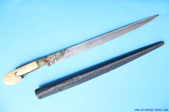 This style of short yataghan sword is sometime referred to as "Naval Yataghan", probably due to its short blade. This exemplar has a finely forged blade, of sham steel, 15 1/2 inches long with a pronounced T shaped spine. The grips are walrus ivory and the grip strap and bolsters are engraved gilded silver set with coral stones. This Yataghan comes with its original scabbard, covered with finely tooled leather, stitched with its original spiral stitching. Total length 23 inches. Good condition. Old repair to one of the walrus ears, minor loss to the leather cover. |