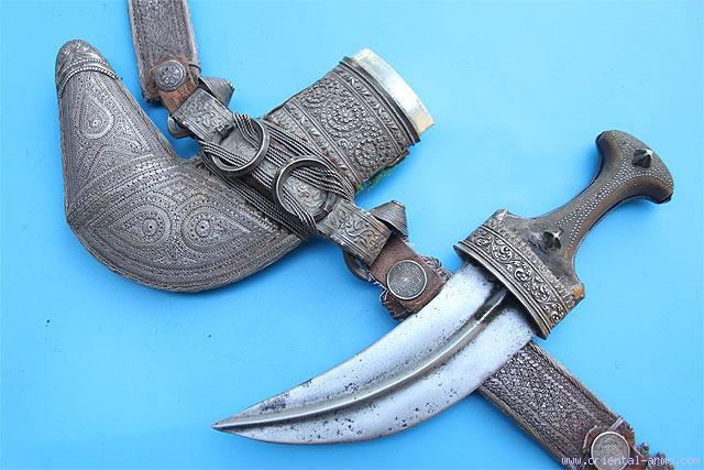 A fine Arab Jambiya dagger, early 20 C. from Oman. It has a 7 inches curved and dual edge blade of good steel with a pronounced central rib. Hilt carved from rhino horn with a chased silver collar. The scabbard is “L” shaped covered with leather elaborately embroidered with silver strips and wires, and mounted with chase silver locket en suite with the hilt mounts. The belt attachment is made of complicate arrangements of silver rings and twisted silver wire. Total length is 12 inches. Original belt also elaborately embroidered with silver strips and set with two silver Omani (?) coins. Very good plus condition. Impressive example of the famous Arab Jambiya.