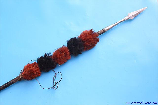 Up for sale is this spear of the Naga people from North East India. Early – mid 20 C. 6 ½ inches steel blade connected with a 5 inches socket to the wood pole which is decorated in the classical naga style with red and black tufts of hair all around. Total length 73 inches. Very good condition. Age cracks on the haft but it holds very solid