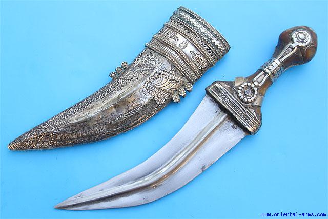 This Jambiya dagger is Yemenite, coming from South Yemen and known also as Hejaz Jambiya. It is late 19C. Blade with pronounced central rib 7 ½ inches long. Horn handle (Possibly Rhino horn) decorated with silver mounts and a silver panel on the back. Pierced silver scabbard. Total length 13 ½ inches. Very good condition. Small damage on the scabbard. |